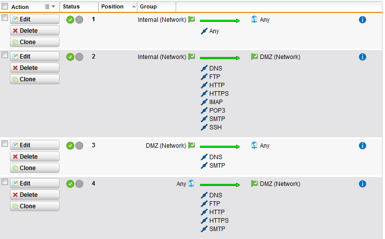 2. in -> dmz : DNS,HTTP,HTTPs,POP3,SMTP,IMAP,FTP